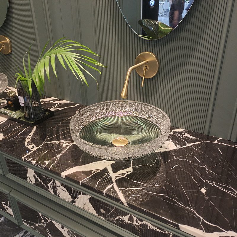 ガラス容器盆は汎用性があり,住宅,ホテル,その他の商業施設などの様々な用途で使用できます.その 独特 な 緑色 の 底 の 色 は どの 浴室 に も 洗練 さ れ た もの と 贅沢 な もの を 添える浴室の装飾で 表現したい人にとっては ぴったりです
